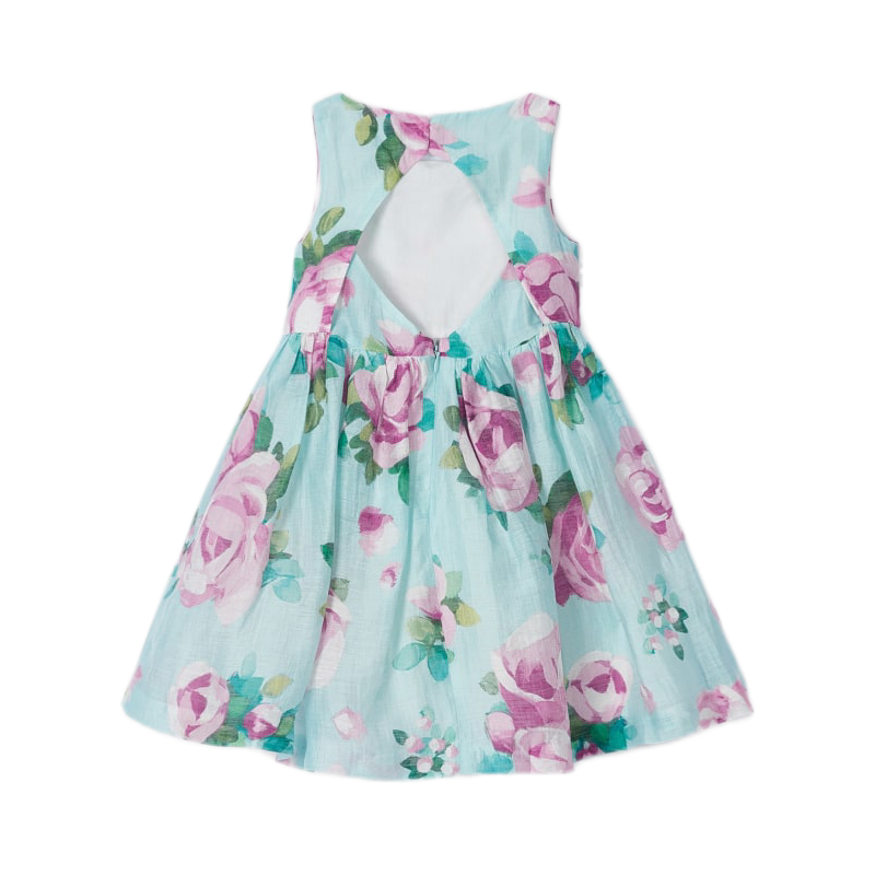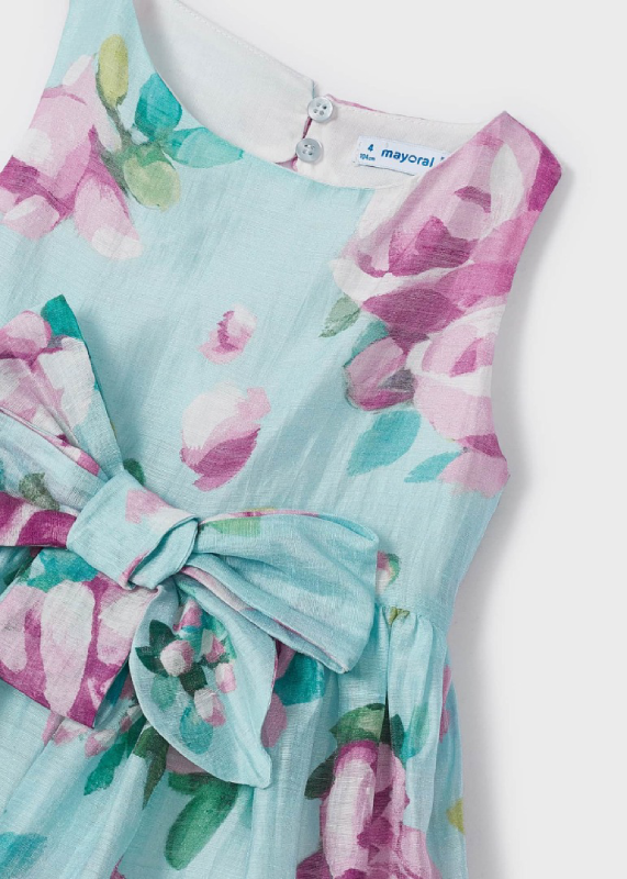 Vestito senza manica per bambina.Tessuto dall’aspetto fresco e moderno di lino. Design con apertura sulla schiena. Elementi decorativi: fiocco. Design stampato.