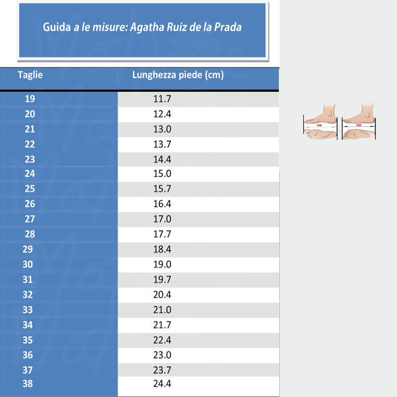 Agatha Ruiz de la Prada Art : 121951, scarpe parla di stile e glamour versione bambina: ecco che le scarpe diventano il must della moderna principessa, con strass e fili metallizzati, abbinati ad applicazioni di cuoricini in velluto o stelle impreziosite da glitter. Per le bambine dallo stile più rock, ecco comparire anche teschi e chitarre elettriche, per una linea di calzature.