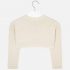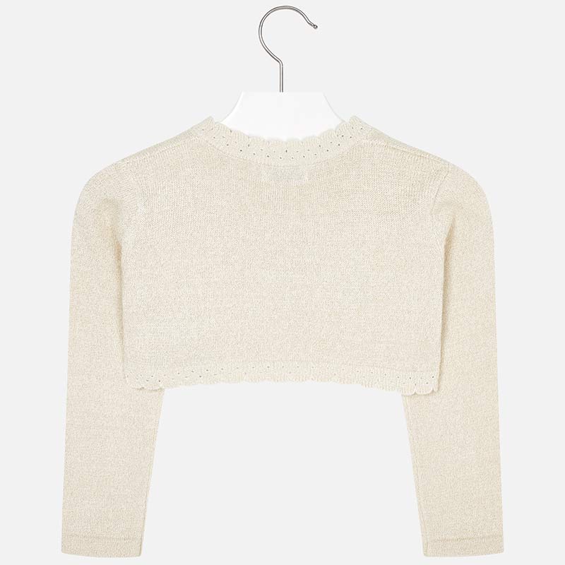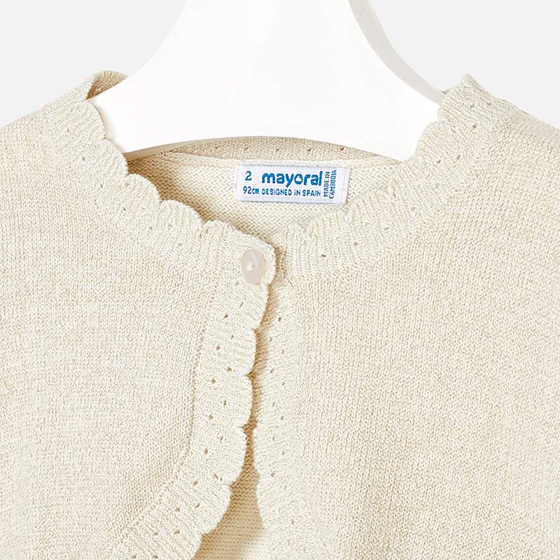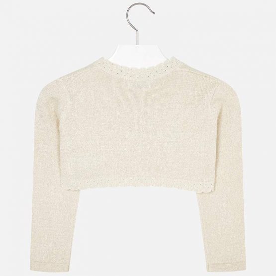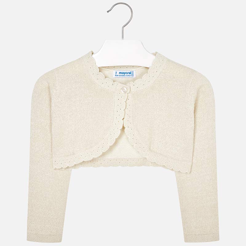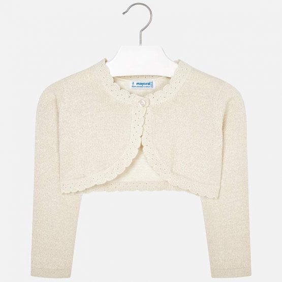 Cardigan manica lunga per bambina con dettagli ton sur ton. Girocollo. Modello corto bolerino. Chiusura con un unico bottone nello scollo anteriore. Comodo tessuto di punto. Design con terminazioni onda.
