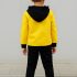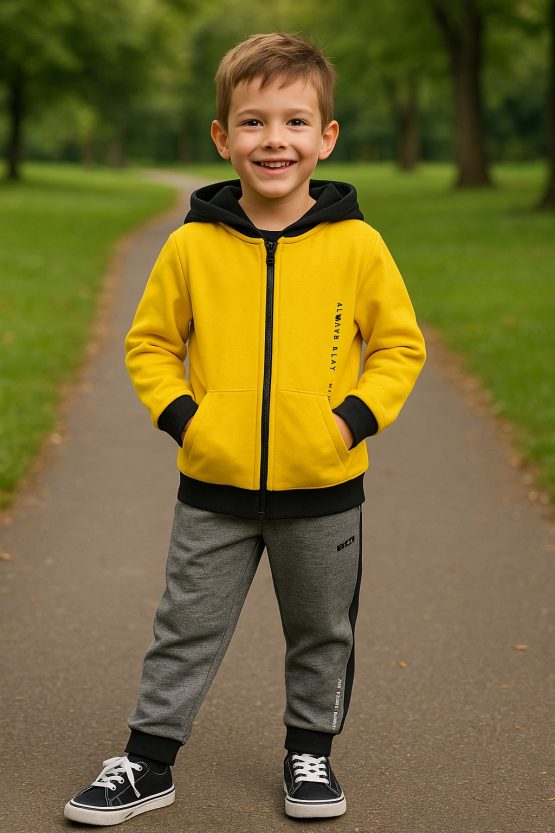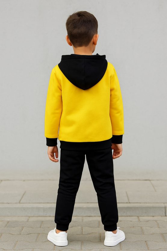 La felpa del completo bambino felpa e pantaloni ha un colore giallo acceso con dettagli neri. Grazie alla zip frontale, il capo è pratico e facile da indossare. Le tasche anteriori aggiungono funzionalità, mentre polsini e orlo elasticizzati assicurano una vestibilità confortevole. Questo rende il completo ideale anche come tuta bambino cotone per tutti i giorni.
