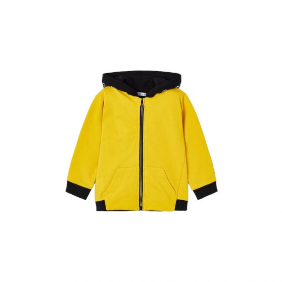 La felpa ha un colore giallo acceso con dettagli neri a contrasto. Grazie al cappuccio e alla zip frontale, il capo è pratico e facile da indossare. Inoltre, le tasche frontali sono utili per riporre piccoli oggetti. I polsini e l’orlo elasticizzati garantiscono una vestibilità confortevole e sicura.