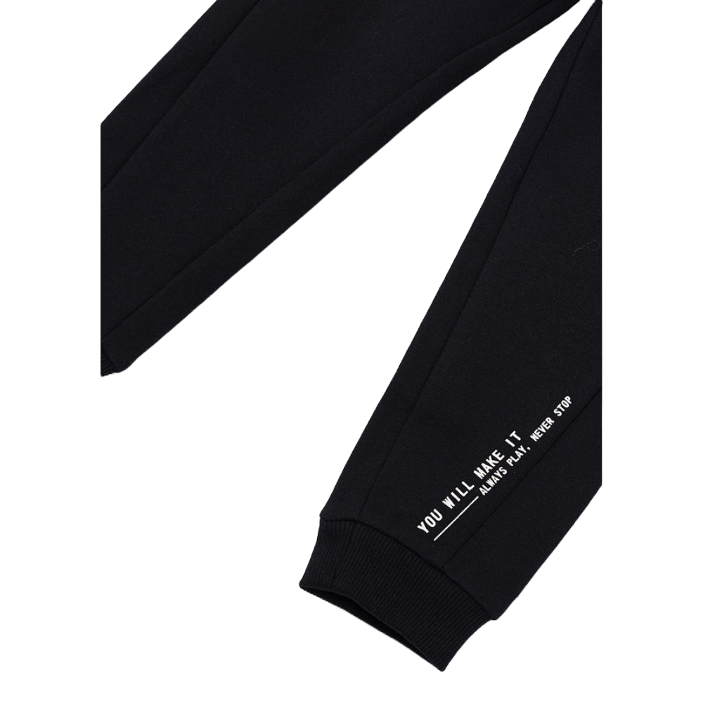 I pantaloni del completo bambino felpa e pantaloni sono disponibili in due varianti: grigio melange con dettagli neri e nero con scritta motivazionale. Entrambe le versioni hanno vita regolabile con coulisse e polsini alle caviglie. Quindi, il capo risulta comodo e pratico per il tempo libero. Inoltre, il design moderno li rende un perfetto outfit sportivo bambino.
