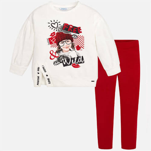 Completo felpa leggings bambina 3 a 9 Anni Mayoral. Morbido tessuto in cotone elasticizzato. Felpa manica lunga con polsini elasticizzati. Spacchetti laterali in basso.