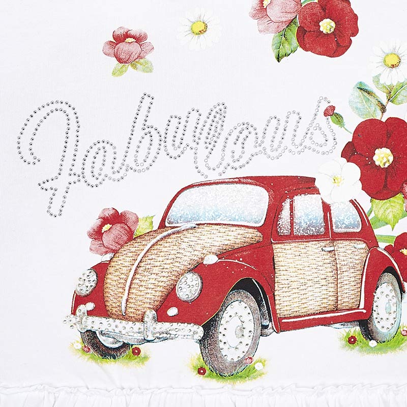 Maglietta manica corta. Girocollo. Linea dal design casual ampio lungo i fianco abbinabile a pantaloni o leggings. Design con volant decorativo nella parte bassa. Elementi decorativi: disegno nella parte anteriore, fiocco, strass. Stampa con motivi del mondo dei motori.