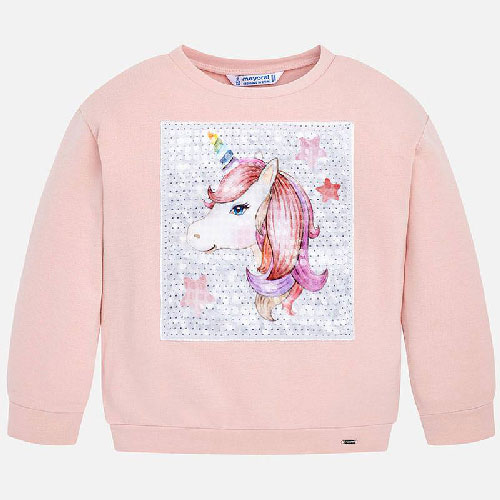 Felpa manica lunga per bambina. Girocollo. Morbido tessuto di cotone elasticizzato. Elementi decorativi: disegno nella parte anteriore, paillette, perline. Per motivi di sicurezza, le taglie piccole (2-3 anni) possono subire alcune variazione negli elementi decorativi utilizzati.