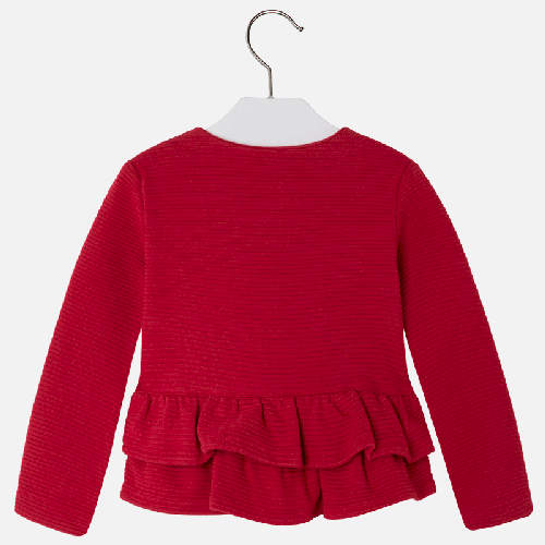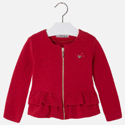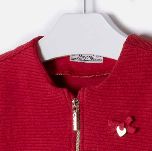 Originale giacca elegante e femminile. Realizzata in punto ottomano con diverse rifiniture: in tessuto liscio e a righe orizzontali nella parte laterale anteriore. Chiusura con cerniera di nylon ed è dotato di volant nella parte inferiore. Il colletto è tondo con un piccolo fiocco cucito sul petto. Abbinabile a pantaloni eleganti i casual e bluse.