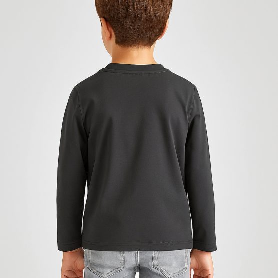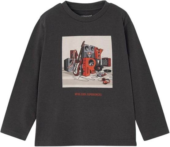 Maglia bimbo manica lunga con stampa chitarra in morbido 100% cotone, colore grigio antracite. Capo comodo per scuola e tempo libero, perfetta sotto felpe o giubbotti.