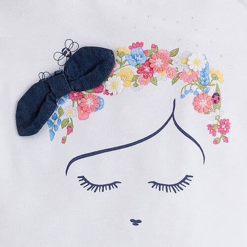 Maglietta manica corta con bretelle bambina, realizzato in jersey. Risaltano le maniche con 5 fasce con riccio. Con una simpatica serigrafia nella parte anteriore.