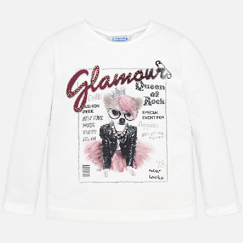 Maglietta manica lunga per bambina con dettagli a contrasto. Girocollo. Morbido tessuto di cotone elasticizzato. Elementi decorativi: disegno nella parte anteriore, perline, strass, volant decorativi. Per motivi di sicurezza, le taglie piccole (2-3 anni) possono subire alcune variazione negli elementi decorativi utilizzati.