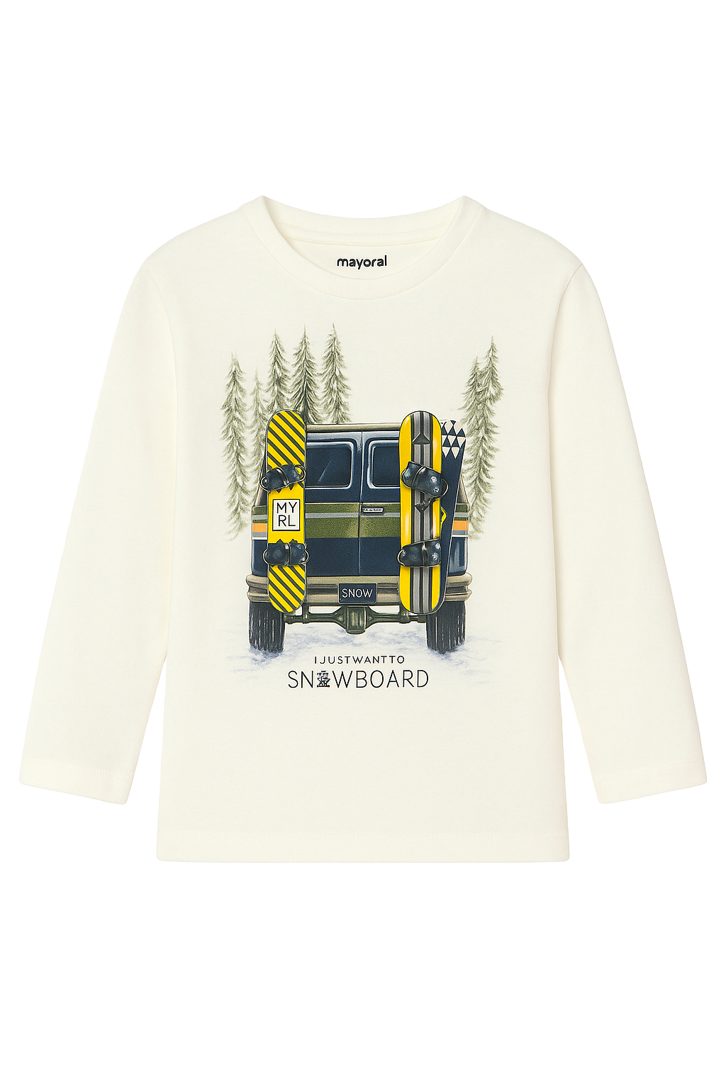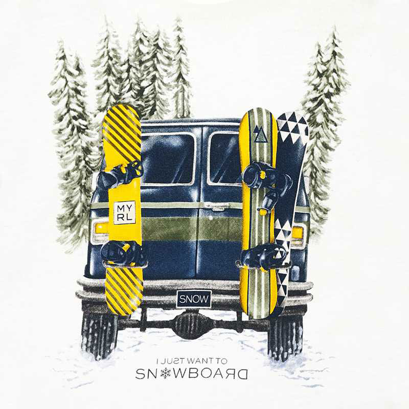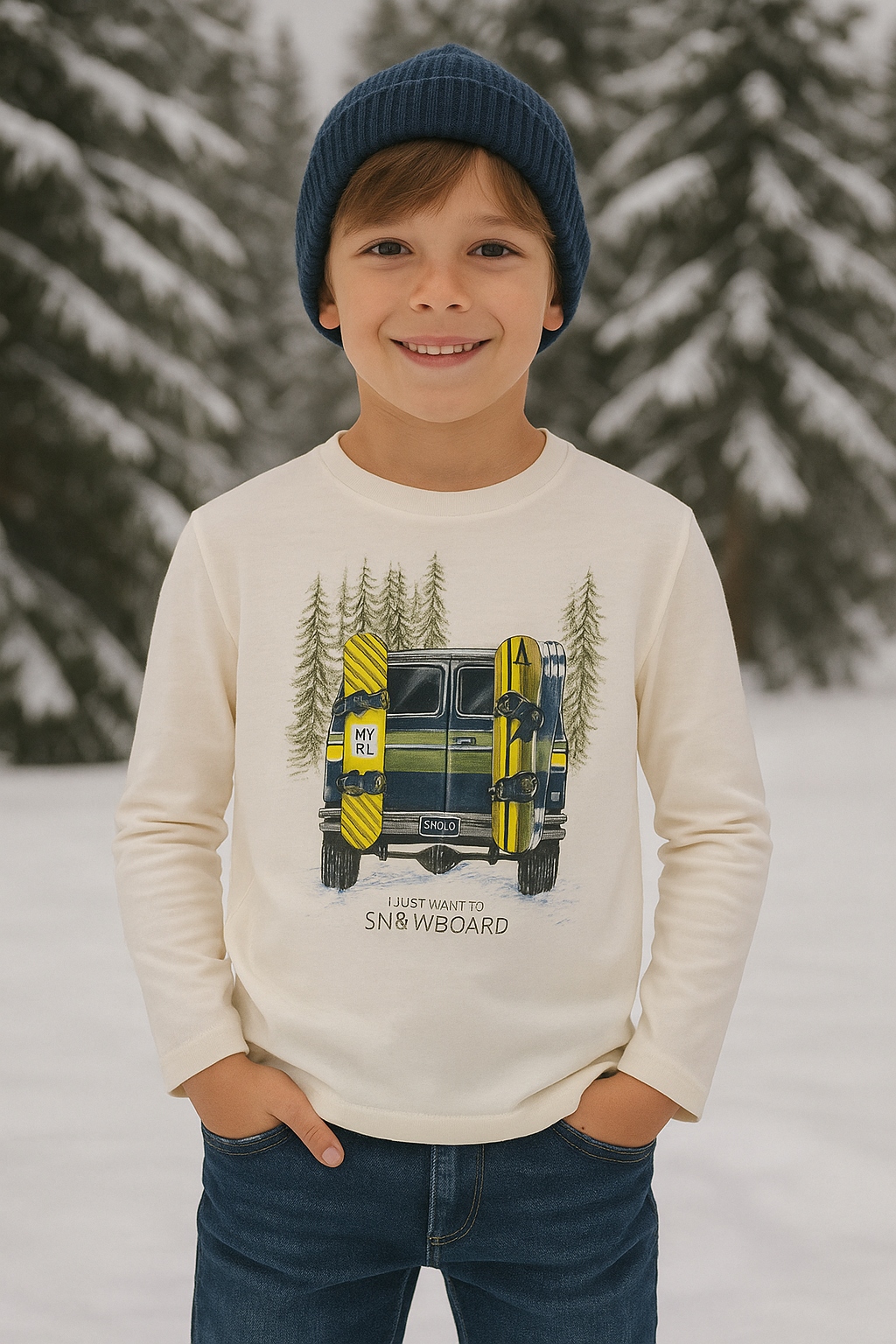 La maglietta manica lunga bambino 3-9 anni firmata Mayoral è la scelta ideale per i genitori che cercano qualità, stile e comfort per il guardaroba dei più piccoli. Realizzata in 100% cotone, questa t-shirt garantisce morbidezza e resistenza, mantenendo la pelle fresca e comoda in ogni momento della giornata. Il colore bianco panna è arricchito da una stampa grafica a tema snowboard, con dettagli gialli e blu che donano un look vivace e moderno. Inoltre, il tessuto è traspirante e adatto anche alle pelli sensibili.
