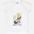 Maglietta manica corta attillata e femminile. Realizzata in jersey elastan con maniche con fasce con sette fila di fasce arricciate e spacchetti laterali. Sul petto una serigrafia con motivi fantasia, applicazione con fiore ricamato e fiocco in popeline.
