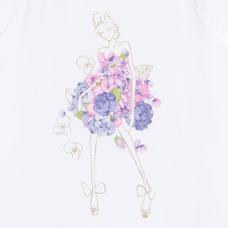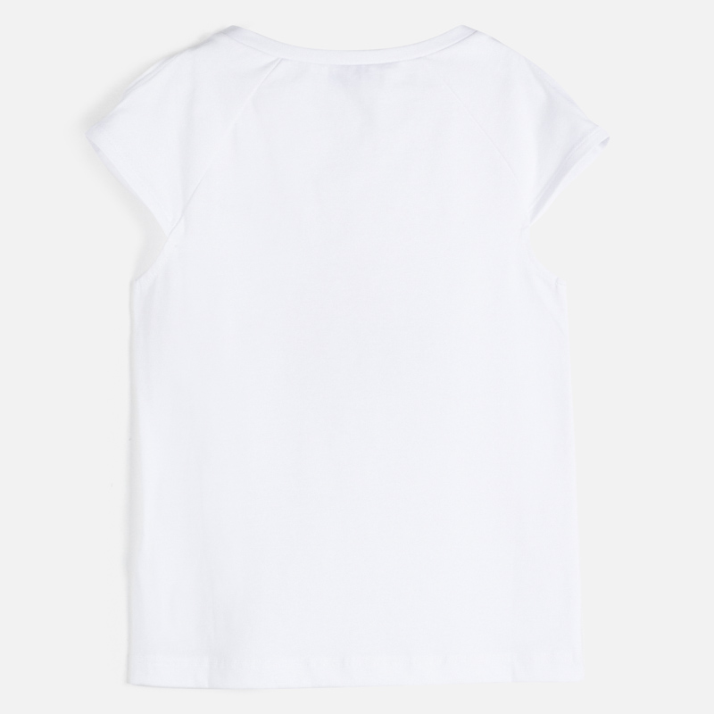 Maglietta manica corta per ragazza. Morbido tessuto di cotone elasticizzato. Elementi decorativi: disegno nella parte anteriore, glitter, strass.