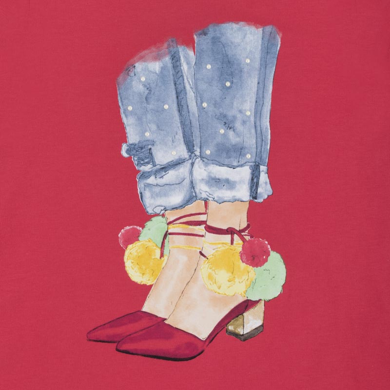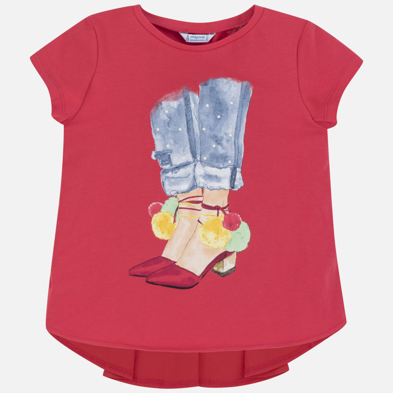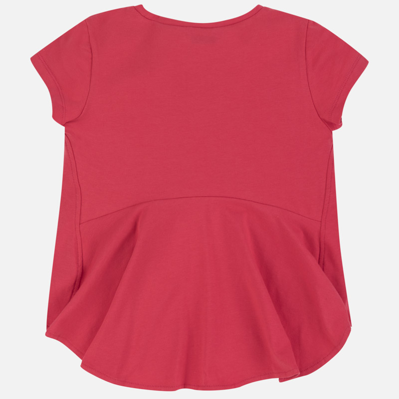 Maglietta manica corta per ragazza. Girocollo. Linea dal design casual ampio lungo i fianco abbinabile a pantaloni o leggings. Morbido tessuto di cotone elasticizzato. Design orlo asimmetrico. Elementi decorativi: disegno nella parte anteriore, perline.