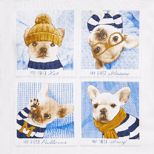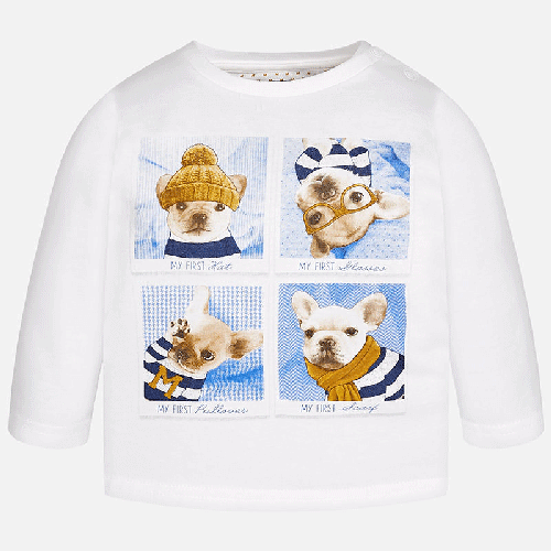 Simpatica maglietta manica lunga realizzata in jersey strutturato dal design liscio con una deliziosa serigrafia nella parte anteriore. Con colletto a costine e tondo, con due anellini per facilitare il passaggio della testa. Abbinabile a capi della collezione sportiva e urbana.