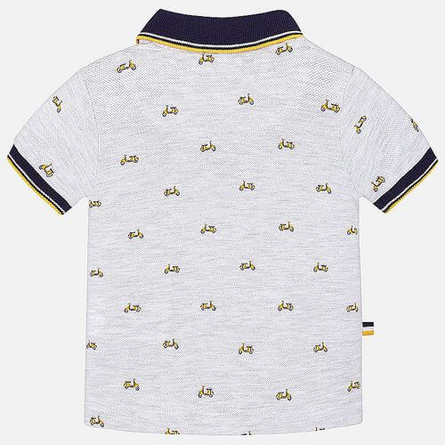 Polo bambino manica corta stampata, realizzata in granito e popeline a righe. Colletto e maniche a costine di tricot, delizioso ricamo nella parte anteriore. Spacchetti laterali.