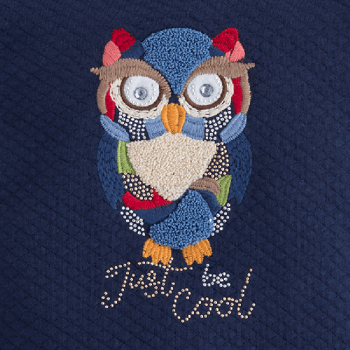 Delizioso vestito manica lunga realizzato in felpa e pellicciotto. Nella parte anteriore e nei polsini, la felpa è imbottita. Il disegno della parte anteriore presenta applicazioni ricamate sul quale si inseriscono borchie per completare la decorazione. Risaltano le cerniere nella zone delle spalle.