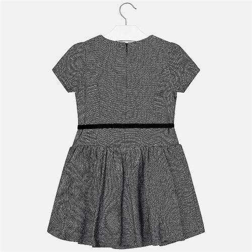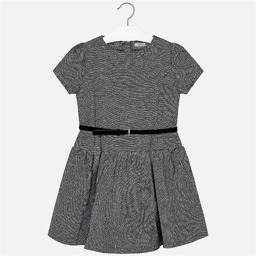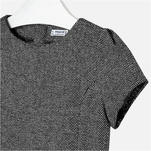 Vestito manica corta , girocollo 10 a 16 Anni Mayoral. Modello con taglio e riccio sui fianchi. Apertura posteriore con cerniera invisibile. Originale tessuto strutturato con motivi in rilievo. Cintura rimovibile in vita.
