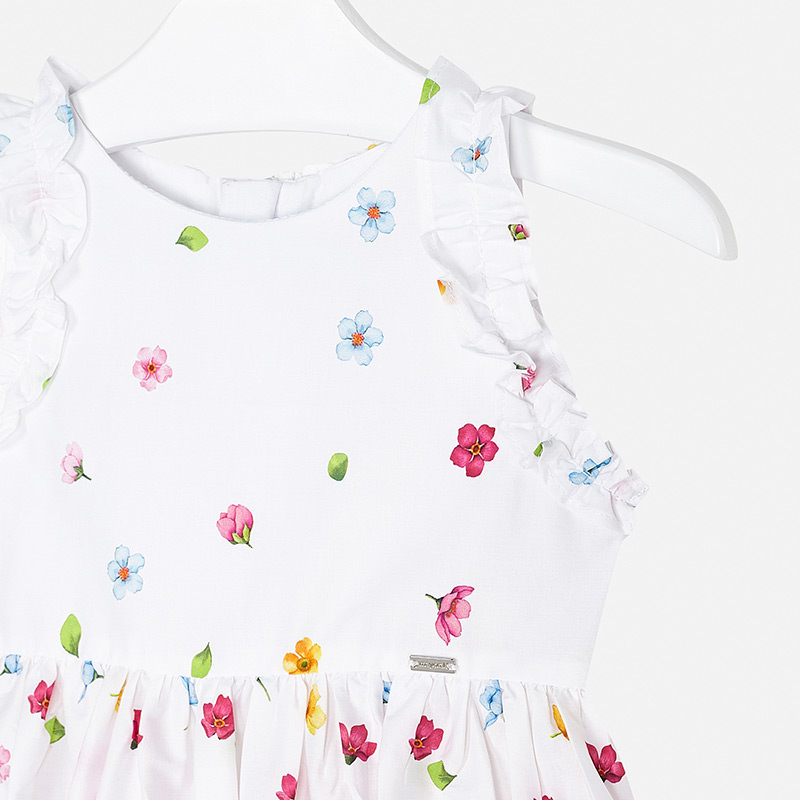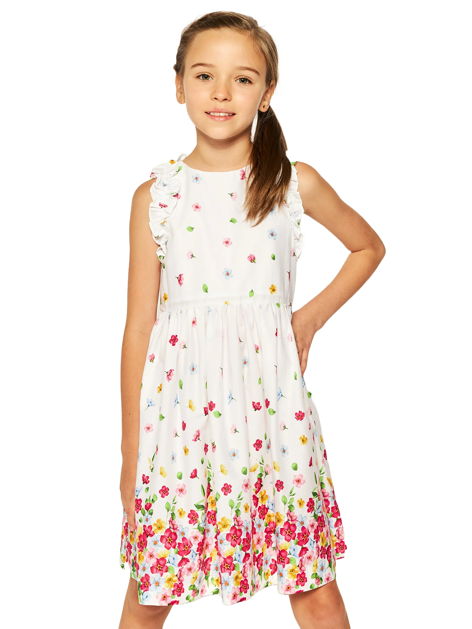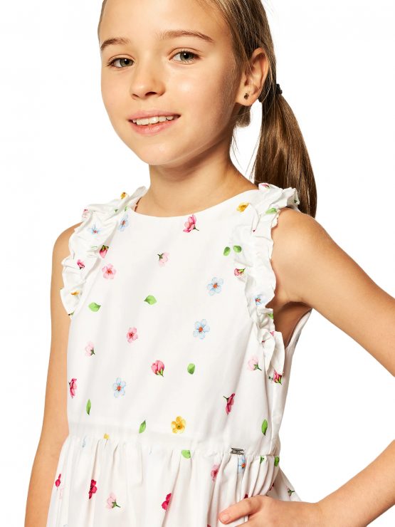 L’abito bimba fiori con rouches COD 3951E unisce eleganza spensierata e praticità. Il tessuto esterno in cotone con una piccola percentuale di elastan assicura morbidezza e libertà di movimento, mentre la fodera in misto poliestere e cotone dona struttura e comfort. Il motivo floreale all-over, più intenso sul bordo della gonna e delicato sul corpino, rende questo modello ideale per cerimonie leggere, feste di compleanno o passeggiate estive.
